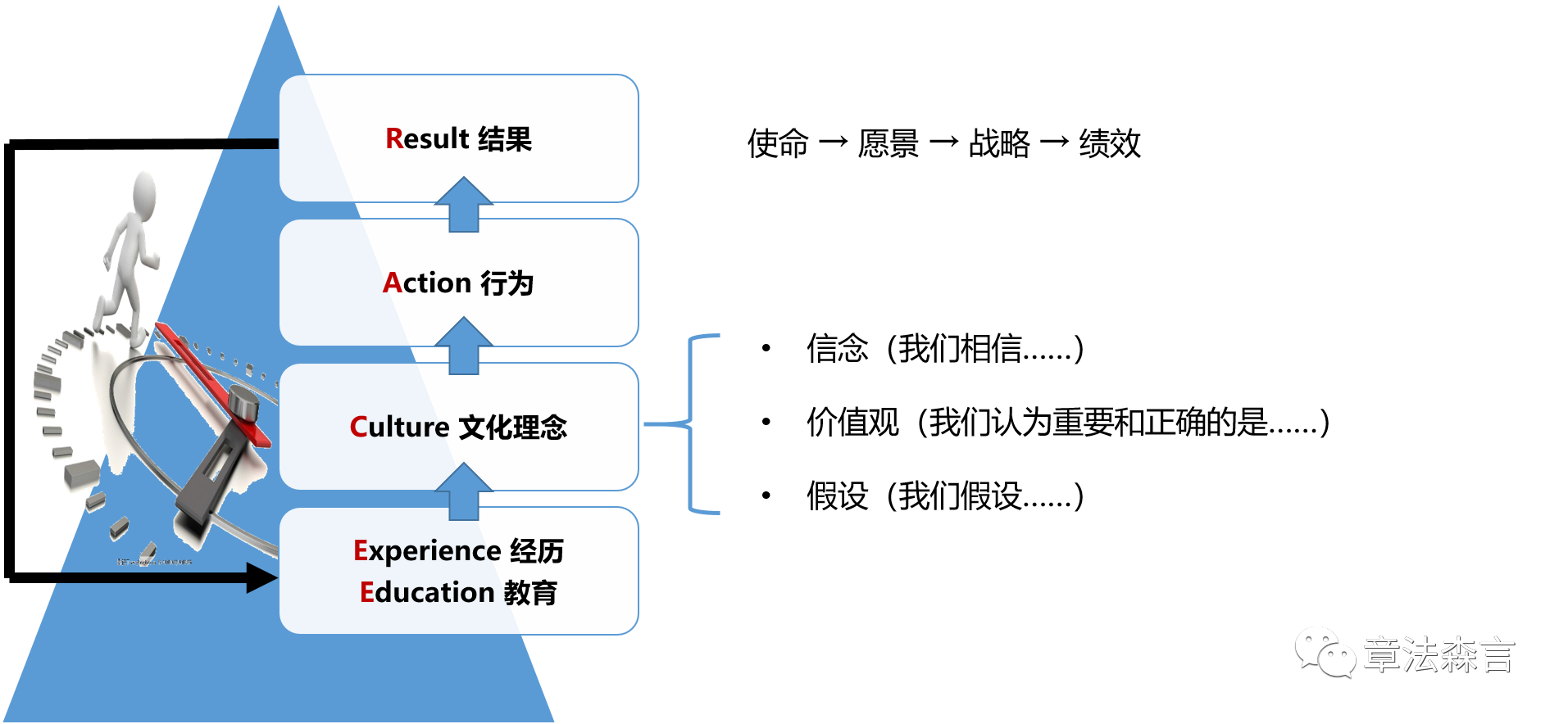 笔者对于企业文化的定义,有一个RACE(循环)模型:组织是理性的,追求结果的,组织的使命,愿景、战略到绩效目标都是对于结果的描述。这些结果的实现,需要员工发生行为来实现,发生行为的背后是员工的文化理念在驱动,而这些文化理念来自过去的经历和被接受的教育。行为产生结果本身就会形成一段经历,从而构成一个循环。
