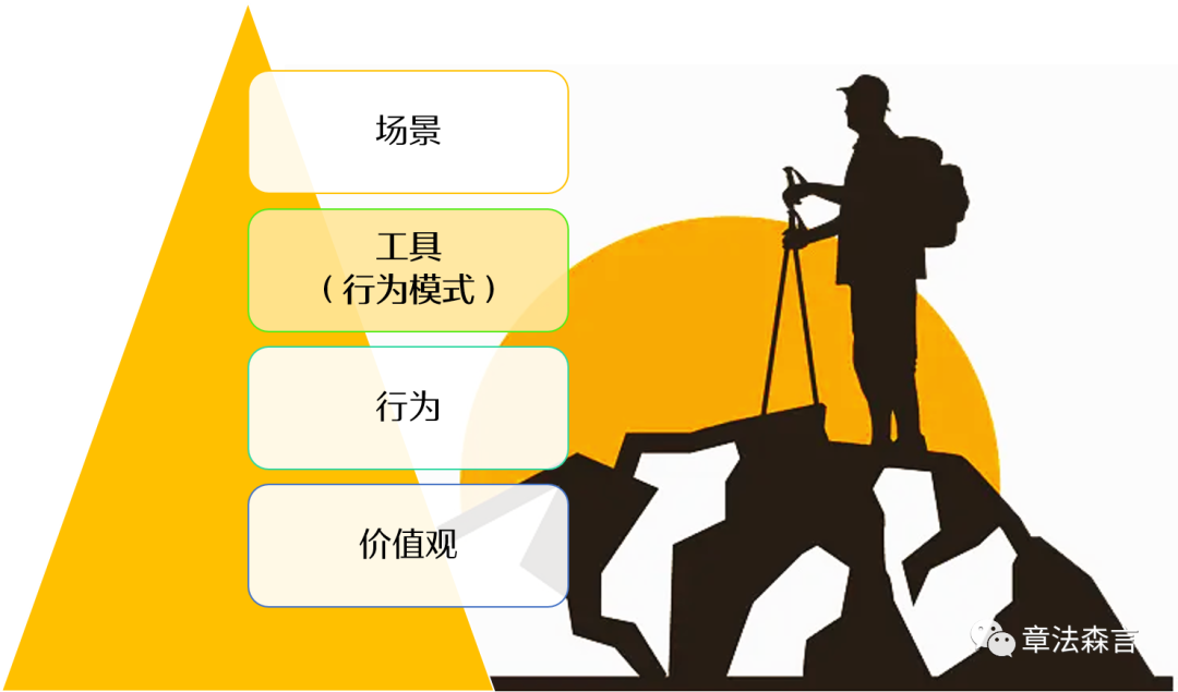(3)通过工具配置(行为模式)来践行文化价值观。我们都指导价值观引发行为,行为的表现在具体的一个个组织中的工作场景,而行为如何更好地在场景中发生呢,这里如同我们登山需要拐杖(工具)来进行支撑,从而更好第践行价值观的行为。