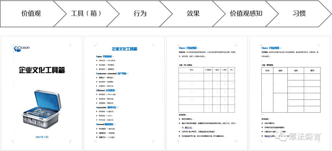 这里笔者举了一个实践例子,每个价值观配置系列工具箱,通过使用工具来指导行为,让员工来体验行为的效果,从而感知价值观的实用性,从而不断践行,最终养成符合价值观的行为习惯。笔者也在自己的实践中,一直为企业的价值观配置工具箱,让文化“有用,可用“!