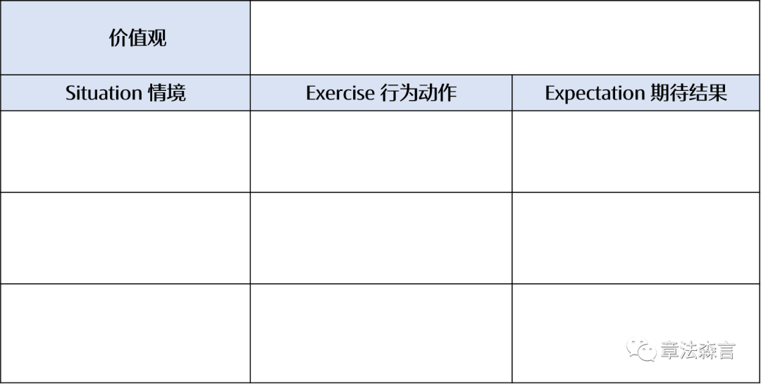 (1)用“场景”去关联“行为”,可以使用SEE语法(下图模型)来对每个核心价值观进行定义出企业文化的行为规范,特别是S情境,体现出价值观对于工作的关联性。