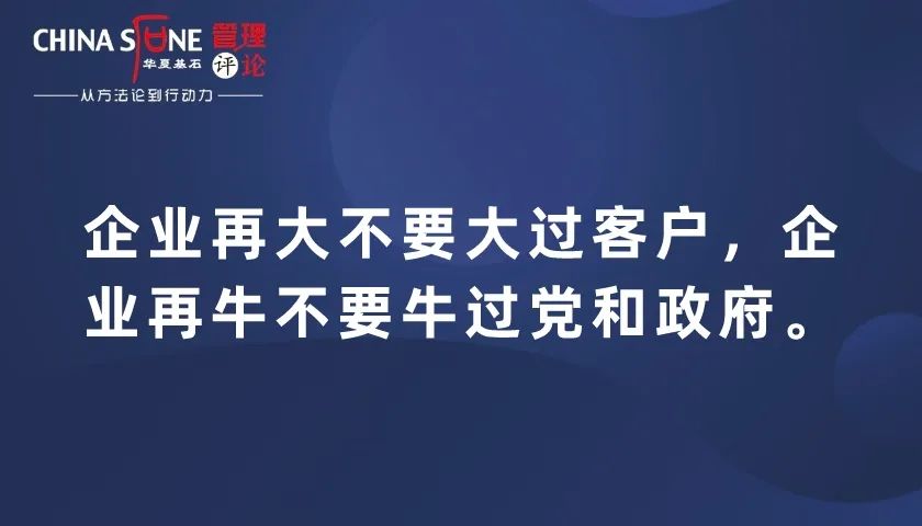 企业家不管取得多么大的成功,也不要认为自己能超越时代。我在朋友圈里发过一句话:企业再大不要大过客户,企业再牛不要牛过党和政府,个人再伟大不能伟大过时代。