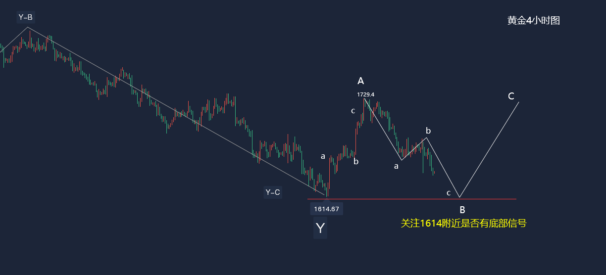 3、4小时级别,从2070下跌至1614走出了完整的双重三浪结构,目前1614上涨1729是走新的驱动结构,还是继续走三重三浪后面还有待继续观察,主要是1614上涨1729内部只走了3波结构,这样的走法更像是A浪,我们假设1614-1729为A浪,那么1729下跌为B浪,B浪内部同样是三波结构,目前B-C没有结束,下方还有空间,本周短线操作上仍然可以逢高去布局空单,待B浪结速开始逢低做C浪反弹的多。因此首个支撑1614一线,其次是1600一线。