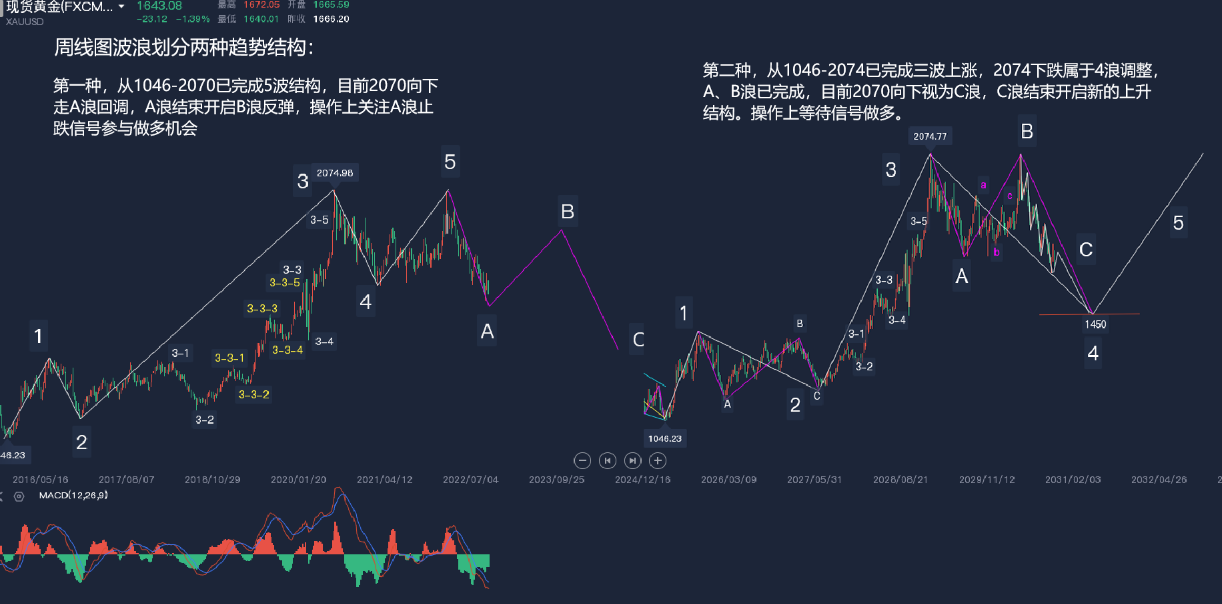 1、大级别来看,周线级别,我们通过波浪理论对周线进行波浪划分,目前两种结构,一种是2070下跌是走大C浪末端即将成大4浪调整,另一种是2070前面5波结构走完,现在下跌是大A浪回调,同样是下跌接近尾声,随时开启大B浪反弹。这两种结构操作上都是寻找底部信号去做多。