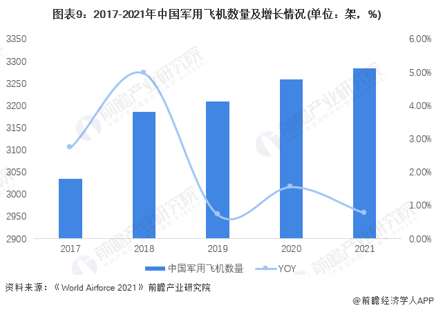 从我国空军的机队规模来看,近年来我国军用飞机数量在不断增加。截至2021年末,我国空军机队规模达到3285架,同比增长0.77%。