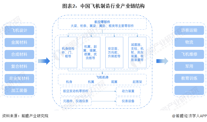 飞机产业链包括前期设计研发、原材料供应、部件制造、整机总装制造、售后维修等环节。飞机制造业通常采取“整机制造商——多级供应商”的制造模式。产业链的第一级为整机制造商,主要从事产品设计、总装制造、市场营销、客户服务和适航取证环节;第二级为关键航空子系统制造商,所提供的子系统包括机体、发动机、航空电子等主要机载设备;第三级主要包括众多为产业链上层的整机a与子系统制造商提供零部件与材料的供应商。