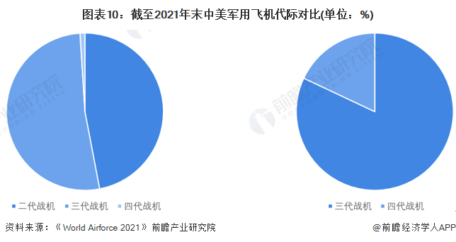 从中美两国的空军飞机代际来看,截至2021年末,在中国服役的战斗机中以歼7/歼8为代表的二代机数量占比约为47%,而以歼10、歼11、歼15为代表的三代机占比约为52%,而歼20、歼31为代表的四代机目前尚未大规模列装部队,其中歼20的服役数量仅19架,占比2%。