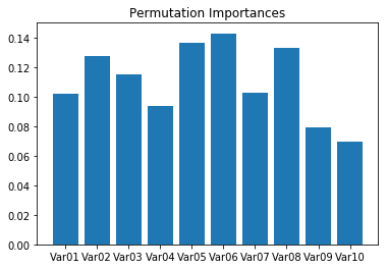由上图的Feature Importances系数结果与分布对比可知,特征Var05对当前模型的重要性是最高的(0.111396),而贡献度最低的为特征Var09(0.092068)。这种方法是我们日常习惯用来评估特征变量对模型的重要性,从而便于模型解释或特征筛选,此指标的分析意义是比较好的,但前边我们已经介绍,Feature Importances仍然存在一定缺点,也并非本文介绍重点,接下来我们通过以上XGBoost模型来输出Permutation Importance排列重要性系数,从而与Feature Importances进行对比分析。