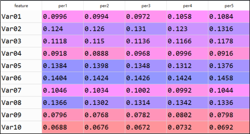 由于生成的特征Permutation Importance结果是一个Dictionary,里边包含了3个数组,分别为importances(n次排列的重要性系数)、importances_mean(平均排列重要性系数)、importances_std(排列重要性系数标准差)。对其输出数据,我们重点希望获取的结果是平均排列重要性系数importances_mean,这里为了说明排列重要性系数的实现过程,我们将importances、importances_mean依次提权并转化为DataFrame来分析,其中importances的排列系数分布结果如图8所示。