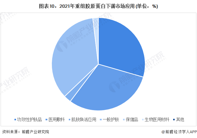 由于重组胶原蛋白具有低排异反应、无动物源病毒携带风险等优点,其在医疗美容及护肤品领域的应用更加广泛。根据弗若斯特沙利文的数据,2021年,中国29%的重组胶原蛋白用于功效性护肤品、31%的重组胶原蛋白用于医用敷料、35%的重组胶原蛋白用于一般护肤品。