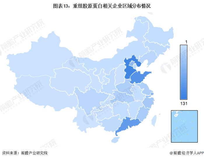 目前中国胶原蛋白生产企业具有较强的聚集性,华北地区的河北、山东地区为我国胶原蛋白生产企业最多的省份;其中河北地区胶原蛋白企业主要生产食品用胶原蛋白肠衣。另外广东地区也有较多的胶原蛋白生产企业。