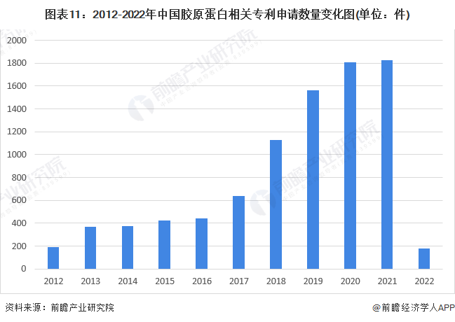2012-2021年,我国胶原蛋白相关专利申请数量快速增加,2020年和2021年已经超过了1800件,说明近几年国内胶原蛋白行业技术进步速度很快。