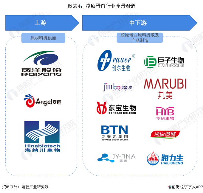 胶原蛋白行业上游企业包括百洋股份、安琪酵母、海纳川生物等胶原蛋白制备原材料厂商,中下游为胶原蛋白原料提取及产品制造商,包括创尔生物、巨子生物、锦波生物、东宝生物等。