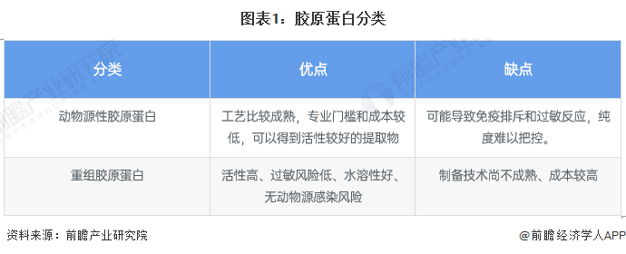 目前中国市场上的胶原蛋白产品按生产方式主要可以分为动物源性胶原蛋白和充足胶原蛋白两种,其中动物源性胶原工艺较为成熟、成本较低,但存在免疫排斥和过敏的风险;重组胶原蛋白虽然成本较高,但产品活性高、无感染风险,目前市场占有率逐渐提升。