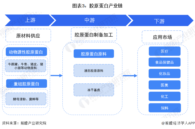 胶原蛋白行业上游产品主要为生产动物源性胶原蛋白所需的牛跟腱等动物原料以及生产重组胶原蛋白所需的酵母浸粉和菌种等原材料。中游为胶原蛋白原料生产商,下游为胶原蛋白各个应用领域。值得一提的是,胶原蛋白行业中,大部分企业兼具中游胶原蛋白原料提取和下游产品加工能力。