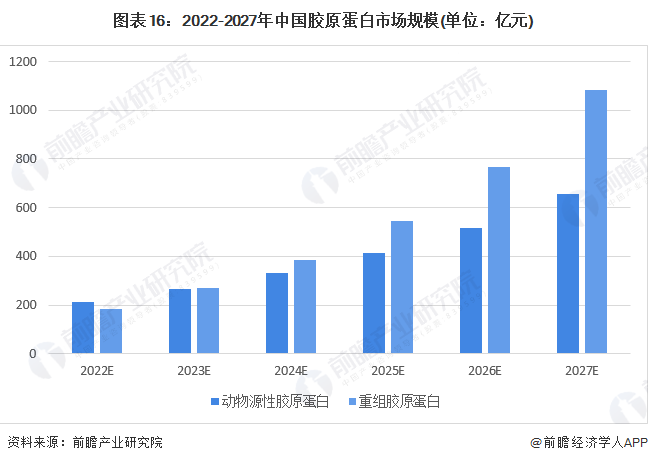 重组胶原蛋白具有无排异风险、无动物源性病毒感染风险等优点,更适合应用于食品及医疗健康领域;根据弗若斯特沙利文的预测,中国重组胶原蛋白市场规模将于2024年超过动物源性胶原蛋白。到2027年,中国胶原蛋白市场规模将会突破1500亿元,其中重组胶原蛋白市场规模超过1000亿元。