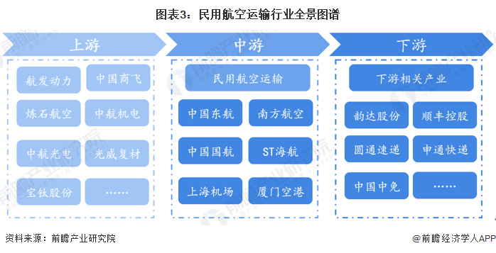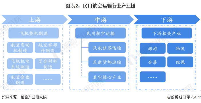 从民用航空运输行业的产业链来看,上游主要包括了飞机制造、飞机零部件制造以及飞机材料制造等一系列从原材料、零部件到整机的供应。中游则是民用航空搞运输行业主要的参与方,民航运输企业与机场。下游则包括了旅游、物流、航空维保等产业在内的多方面应用。