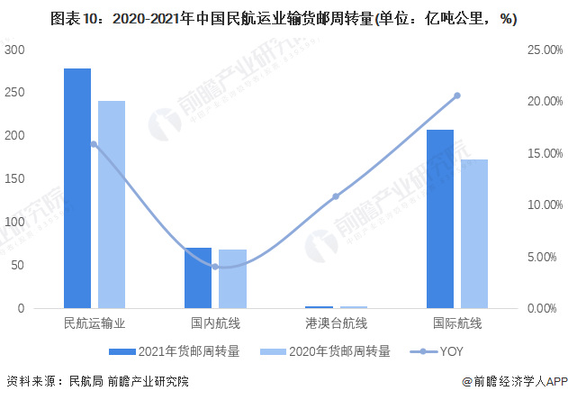 从货邮周转量角度来看,2021年我国民航运输业完成货邮周转278.16亿吨公里,较2020年增长15.8%。其中,国际航线和港澳台航线的增速最快,2021年全年分别完成货邮周转量207.57亿吨公里和2.29亿吨公里,较2020年分别增长20.5%和10.8%。