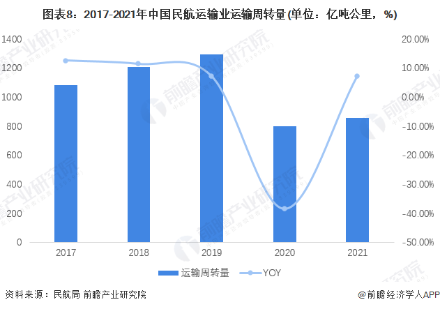 2021年全年,中国民航运输业完成运输周转量为856.75亿吨公里,比2020年增加了7.3个百分点。其中,国内航线完成运输周转量641.14亿吨公里,国际航线完成运输总周转量215.61亿吨公里。