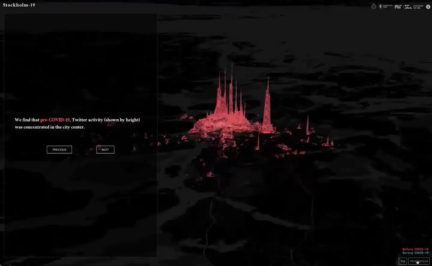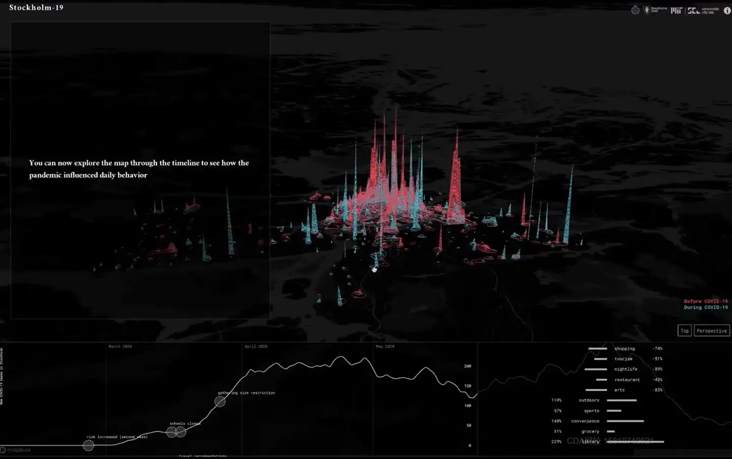 为什么标题叫突破二次元,就要从二维的空间数据的分析来走向三维数据和四维数据。接下来看一个思维案例。在美国麻省理工大学的一个城市感知实验室做的一个斯德格尔摩,在新冠疫情中,城市居民的行为数据发生变化的一个案例。这个案例是一个动态的。