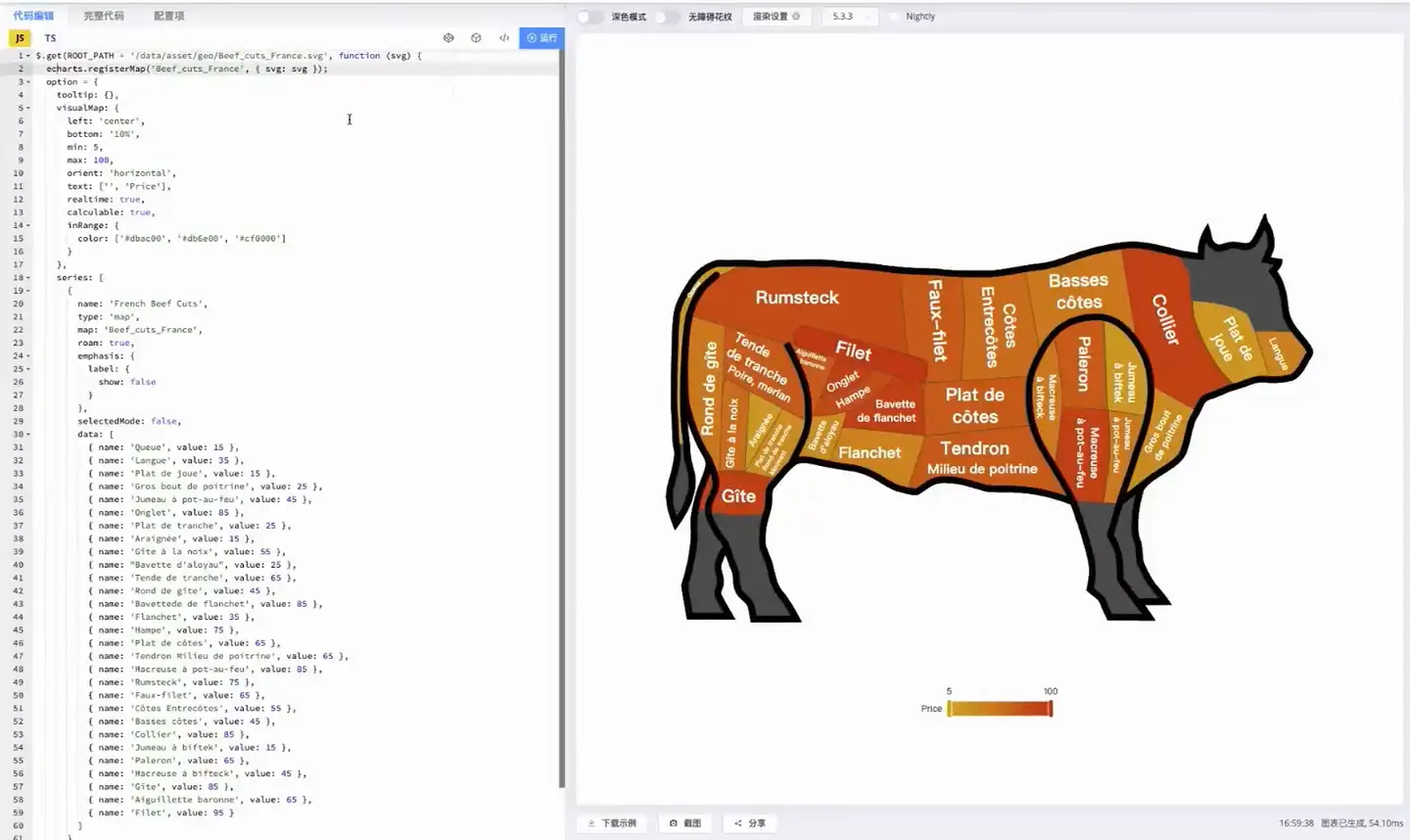 第二个例子,就是很有意思的图,就是可以常吃牛排或者有福建的同学喜欢吃牛肉火锅,牛的不同部位的肉,味道和质感是不一样的,肉的价格也是不一样。这张图展示不同位置牛肉的价格。在鼠标放在不同的位置上,会悬浮窗显示的是顶值是100,小的是 5 ,做了一个相对的比较, 85 的位置。就是知道的费力牛排的位置,标深红色的就是特别贵的,黄色的就是相对便宜的地方。同时,这个图还有一个功能,就是可以筛选出来,比如想吃到 50 到 70 块钱的牛肉,应该取哪一个位置?可以拖动底下位置的轴,把然后上限设为 70 如果是一个开牛肉馆,那客人要吃价位的牛肉,就知道要去选这几款牛肉来提供给客人。