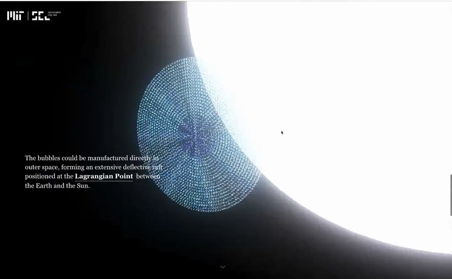 经过这种理论的测算,其实用这个理论推导的话,这样一个气泡的阵列可以减少太阳到地球 1.8% 的一个热量的辐射。怎么来做呢?首先它来构建了是做出了一个可以在外太空来存在的稳定存在的这样一种气泡。其实在实验室已经研制出来了。随后使用空间数据的一个反向推导的方法,这个点就选在了地球和太阳之间第一拉格朗日平衡点的位置。在这个位置,气泡的阵列受到地球和太阳的引力是相等的,它可以稳定地停在这。当把它放大之后,就可以看到构想出了这样一个圆形的阵列,正好把地球挡在它的背后。就是这样一个很简单的创意,但是这个创意就完全跳出了地球,如何来从宇宙的角度,如何来改变我们的气候变暖的问题。