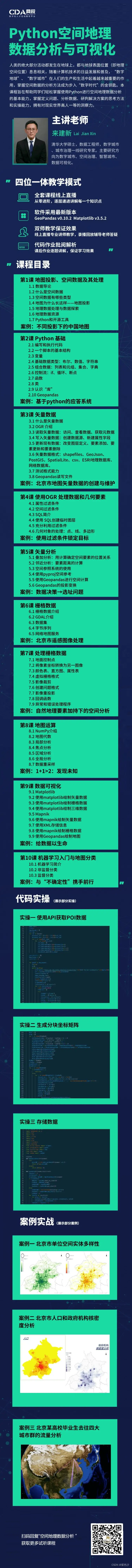 其实空间数据和地理数据是有一些不同的,也可以理解成是一个空间的数据。是说空间数据的范畴是更大的地理数据,因为现在是空间数据中体量最大的一类空间数据,所以会把地理数据作为一个主要分析的对象,来作为操作的一个实体。通过对地理数据的分析过程的练习,掌握了对地理数据分析之后,面对其他类别的空间数据,思路方法是一样的。
