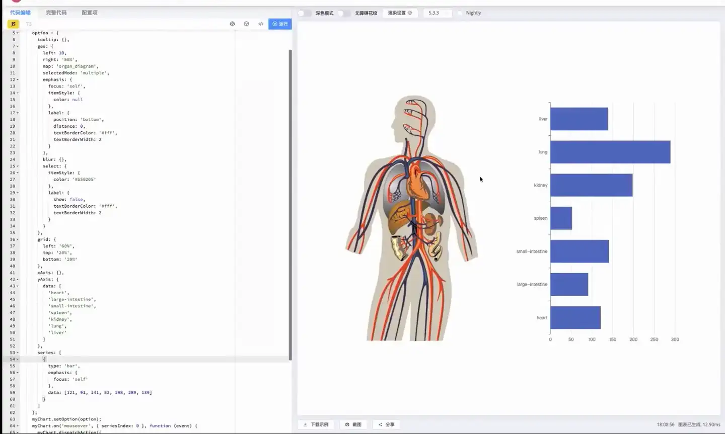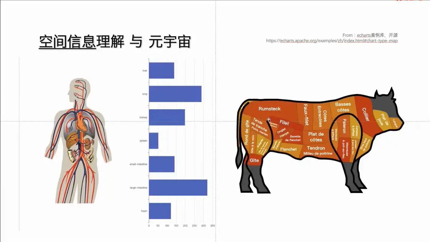 为什么说人体图也是一种空间数据?其实空间数据只要分析的对象实体有空间的属性,就可以用空间分析的方法来进行分析。在案例里,当我们来把鼠标放上来,会来高亮鼠标所在的一个器官。右侧的数据,可以在左侧的代码里去来决定我这个数据右侧的柱状图代表的是什么。现在让它代表的不同脏器的体积,可以看到肝的体积,两个肺的体积是最大的。然后是肾,它只画出了一个肾,这个是胰腺的体积,是整个脏体里最小的,这是小肠、大肠,这是心脏,这样一个空间分析的过程。