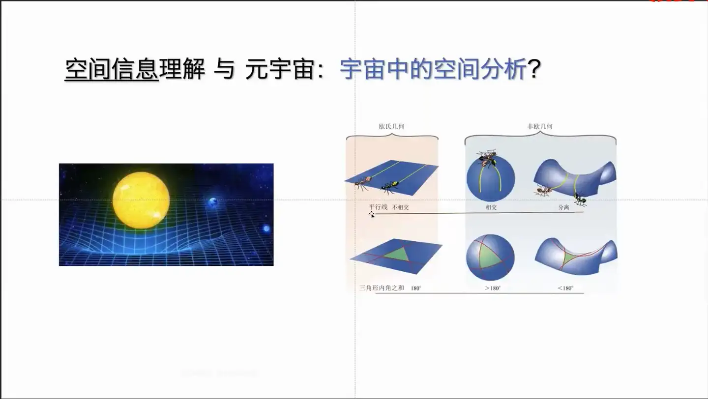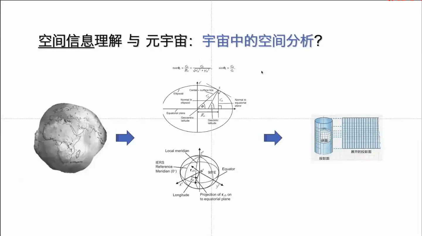 如果要走出地球面向宇宙中的做一个分析的话,大家知道,像广义相对论提出了一个观点是重型天体周围的空间是被扭曲的,像地球和太阳周围的空间,不是平直的,会有一个形象化的向左边这个图来展示的,是有一凹陷的,这种平面就是一个非欧几何。笛卡尔坐标系平值的坐标系是建立在欧式几何的一个框架内。在非欧几何一个框架下,欧式几何就用不了。但是可以发现它之间的相似性。就是说其实大 地坐标系也是的非欧式几何的一个模型。可以通过一个投影的算法,把它投影到一个平面的过程。对于任何的从三维向二维的转化的过程,只要它是空间的数据,都可以认为是一个投影的过程。只不过投影是需要使用一些数学的算法来进行计算。像这个图里来,可以看到上边这个椭圆体,通过一些角的方法几何的方法,然后有一些累加累成公式其实特别长,这就没放通过一些方法是可以转化过来的。那么一旦转化过来之后,就可以使用丰富的一种地理数据分析的方法来进行操作。