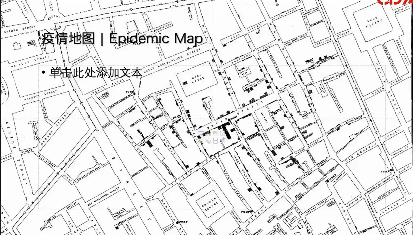 当时政府按照呼吸道传染疾病的方式来,采取的防控措施,让大家来进行掩盖口鼻,没有对城市垃圾和排泄物做一个处理,把所有患霍乱病人的排泄物就连同其他的生活垃圾一起倒入了泰武士河。后来就出现了救世主就是中snow ,他是一名麻醉医生,他在他的助理的协助下,就对看到的这张地图,对于当时这个死亡病例特别多的地方,看到黑色的柱状,其实是一条一条的短黑线来叠起来的。就像其他的地方,每一条黑线就代表一个死亡病例。这个地方死亡病例是最多的,因为都是这种叠起来好高,聚集在一起。他跟他的助理就是围绕着苏河区进行了一个死亡居民与城市设施之间关联关系的一个调查,绘制了这样一个疫情地图。