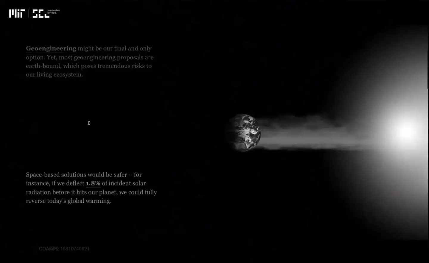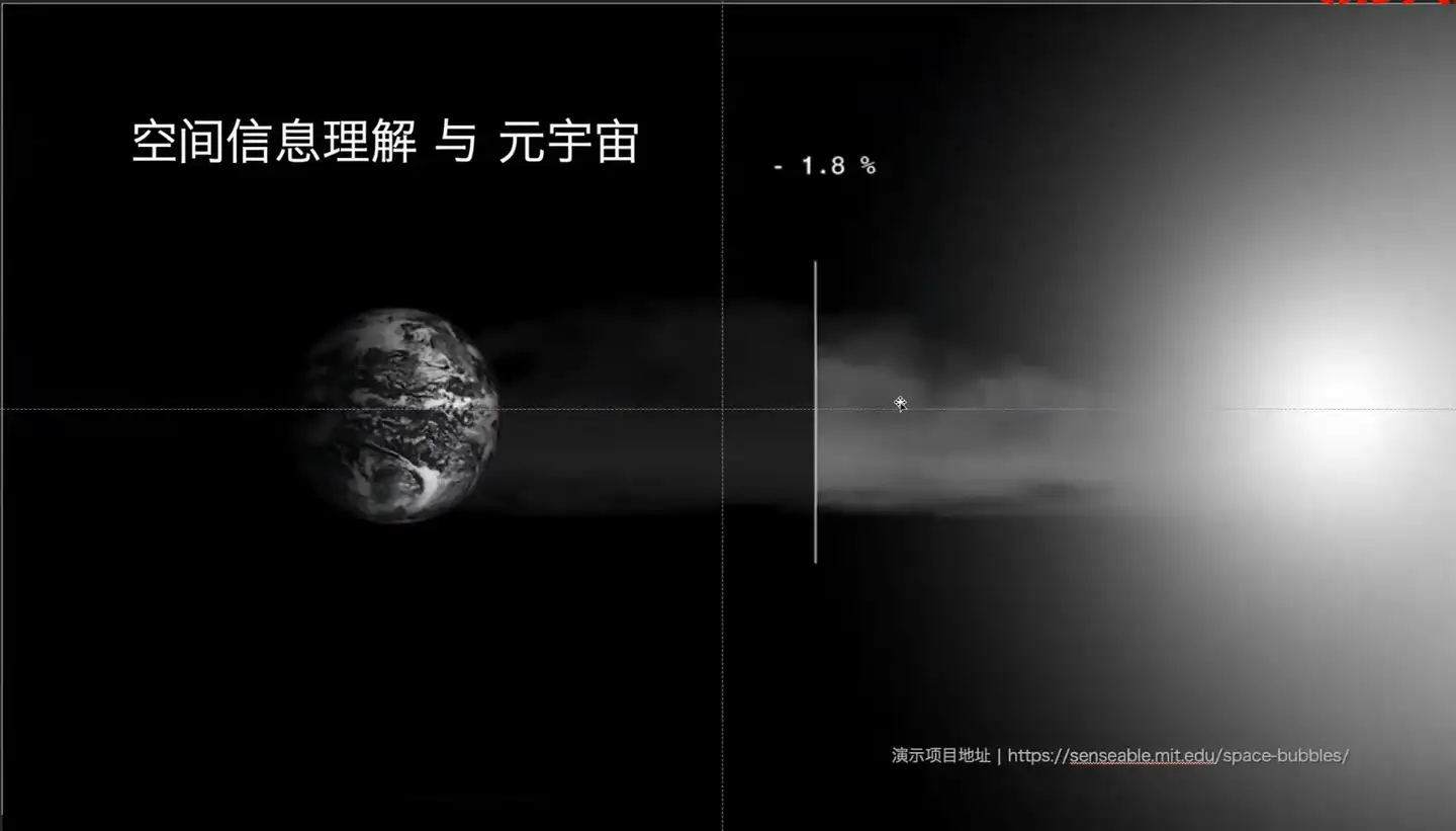 有没有人这样干的,是有的在这个元宇宙之前,来展示一个有人这样干的一个案例。这个案例是什么?背景是现在都面对这个全球变暖。除了改变能源使用方式之外,有没有一种方法就是来减少太阳辐射到地球的热量。这个团队就想出了一种办法,能不能在地球和太阳之间来放一些用这种气泡组成的一个屏障来吸收一部分热量,被称为这个 go engineering 就是这个地理工程的一种方法。