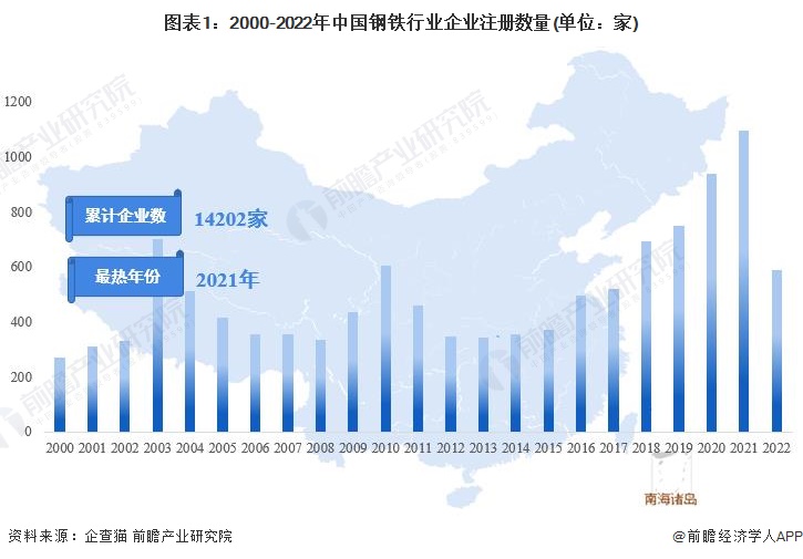 根据中国企业数据库企查猫,目前中国钢铁行业的主要企业共有14202家,其中以2021年为主要注册热潮,2021年全国钢铁注册企业数量达1098家,较2020年增加158家,截至2022年6月29日,全国钢铁注册企业数量达592家。