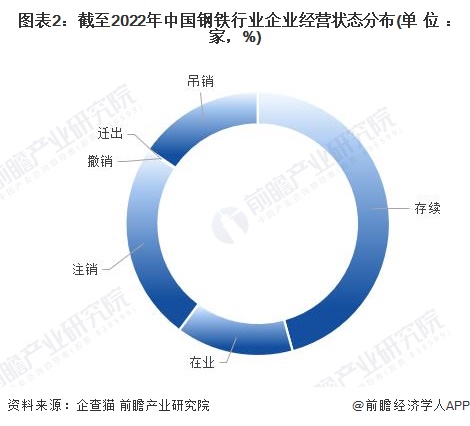 根据中国企业数据库企查猫,目前中国钢铁行业的存续企业6491家,占总企业数的45.74%;在业企业数量达2040家,占比为14.38%;注销企业数量占总企业数的24.27%,吊销企业数量占总企业数的15.48%。