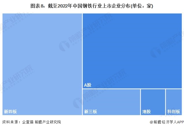 根据中国企业数据库企查猫,目前我国钢铁行业存续和在业的企业共8533家,其中8435家未上市,总来来看,钢铁行业企业的上市率为0.97%。在上市的企业中,以A股和新四板的企业为主,A股企业有34家,新四版的企业有37家。