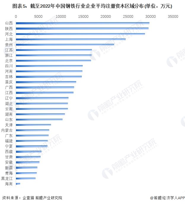 根据中国企业数据库企查猫,目前中国钢铁行业企业的平均注册资本区域分布中,山西省相关企业的平均注册资本最高为29727万元,除此外,陕西省和河北省的钢铁行业企业平均注册规模均在25000万以上,规模相对较大。