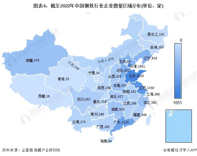 根据中国企业数据库企查猫,目前中国钢铁行业企业主要分布在东南沿海城市和珠三角等地,特别以山东省和江苏省为代表。截至2022年6月29日,山东省共有相关钢铁行业企业数1610家,江苏省则有1330家。