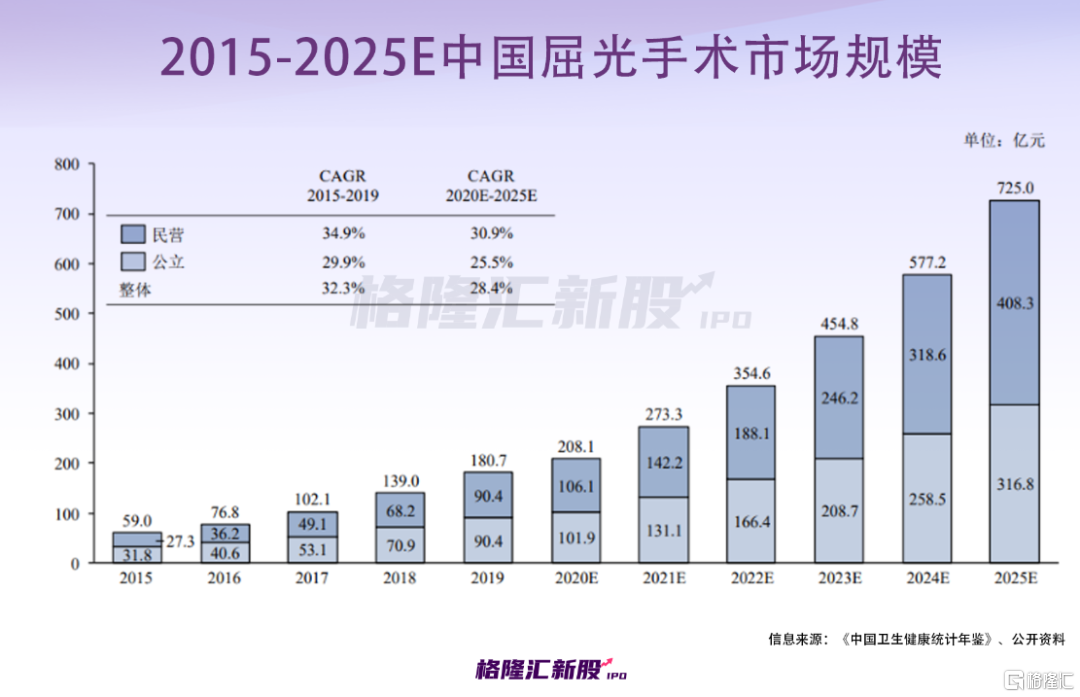 2015年-2019年,中国屈光手术市场规模从约人民币59.0亿元攀升至180.7亿元,期间年化复合增长率约为32.3%,预计2025年将增至725.0亿元,2020年至2025年的期间复合增长率预计为 28.4%,该市场具有一定的想象空间。
