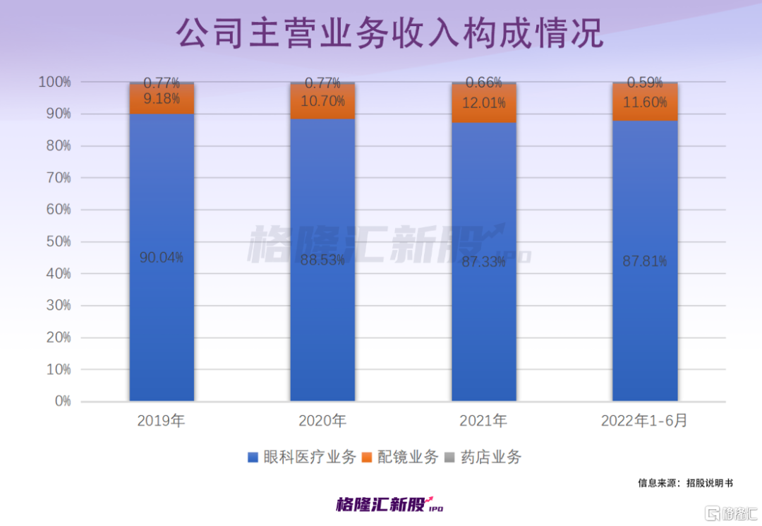 具体来看,公司的主营业务由眼科医疗业务、配镜业务及药店业务构成,其中眼科医疗服务是主要收入来源,其占比在9成左右。