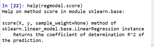 #导入库import pandas as pdimport numpy as np#模拟一些数据data=pd.DataFrame(np.random.randn(10,3),columns=["y","x1","x2"])#导入线性回归类from sklearn.linear_model import LinearRegression#开始建模估计回归系数#实例化一个回归模型regmodel = LinearRegression()#给模型传入测试集数据x和yregmodel.fit(data.loc[:,["x1","x2"]],data["y"])#线性回归训练#计算模型的可决系数regmodel.score(data.loc[:,["x1","x2"]],data["y"])#通过help(regmodel.score)可以看到这个方法返回的是回归方程的可决系数