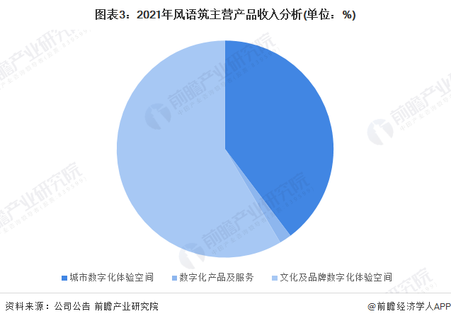 2021年,风语筑主要业务包括城市数字化体验空间、文化及品牌数字化体验空间等,其中文化及品牌数字化体验空间是其主要收入来源。2021年,文化及品牌数字化体验空间业务营收占比为58.49%;其次是城市数字化体验空间业务,占比约为39.70%。