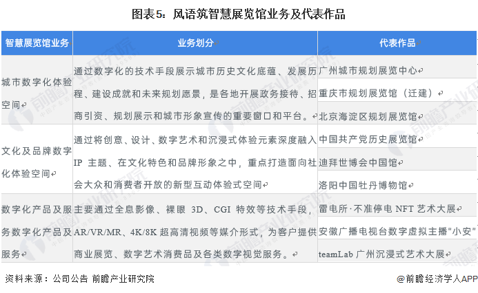 风语筑的产品及服务广泛应用于数字展示、城市文化体验、数字文旅、商业展览及新零售体验、广电 MCN 及数字营销等众多领域。其业务划分与主要代表作品如下:
