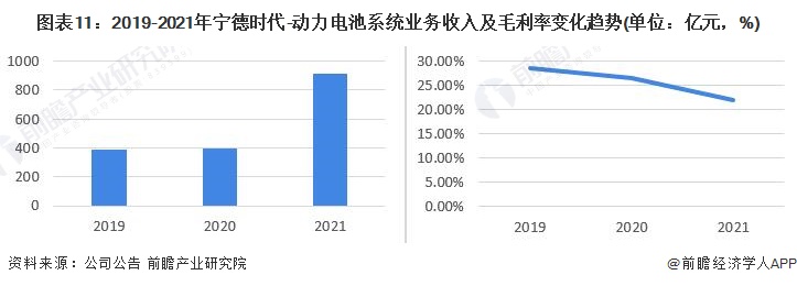 从动力电池PACK业务的经营情况来看,2019-2021年,宁德时代的动力电池PACK业务收入呈现明显增长的态势,由385.84亿元增至914.91亿元,其中2021年动力电池系统营收同比增长达到132.06%。在毛利率方面,2019-2020年,宁德时代的毛利率也呈现下滑态势,由28.45%下滑至22%,根据公司公报的信息来看,主要是由于近两年来企业业务进入快速扩张阶段,前期成本投入较大导致毛利率数据下滑。
