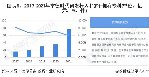 2017-2021年,宁德时代的研发投入金额总体波动上升,2021年,宁德时代的研发投入金额为76.91亿元,占营业收入占比为5.90%,相较于往年有明显增长。截至2021年末,公司整体研发团队规模和实力在行业内处于领先地位。截至2021年12月31日,公司及子公司共拥有3772项境内专利及673项境外专利,正在申请的境内和境外专利合计5777项。