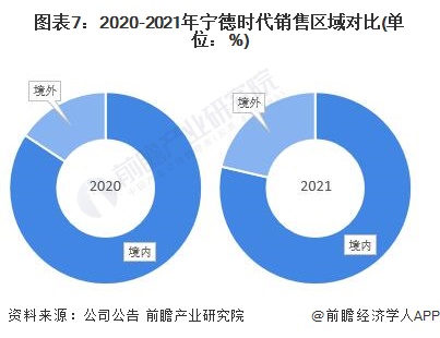 2020-2021年,宁德时代的销售区域以境内地区为主,2021年,宁德时代的境内业务营业收入占比为78.62%,境外地区业务营业收入占比为21.38%。根据宁德时代相关公告,公司亦加快了海外业务布局,充分发挥产品研发优势,提升全球竞争力,从营收来看,公司境外营收比2020年增长了5.67%。