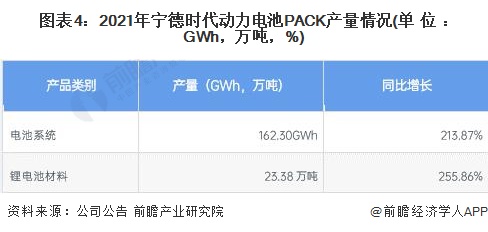 2021年,宁德时代的动力电池PACK产业中,公司电池系统采用三元锂离子电池、磷酸铁锂电池等路线,主要应用于下游新能源汽车、其他电动出行工具、储能系统等,2021年电池系统产量达到162.30GWh,相较于2020年同比增长213.87%,锂电池材料产量23.38万吨,同比增长255.86%,可以看出企业在2021年的生产规模上大幅扩张。