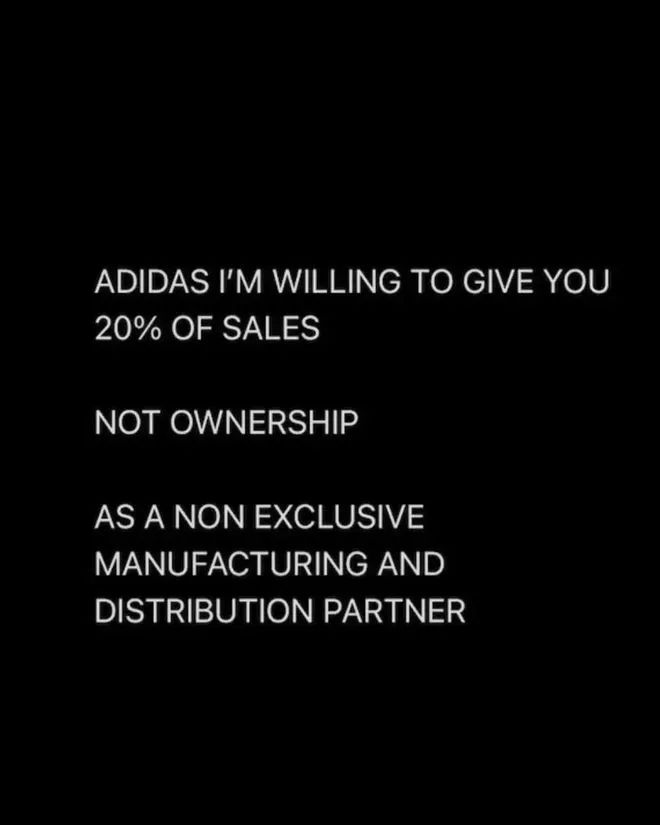 ▲Ye在Ins上喊话阿迪达斯:做我的非独家生产和分销伙伴,我给你们分20%销售额。