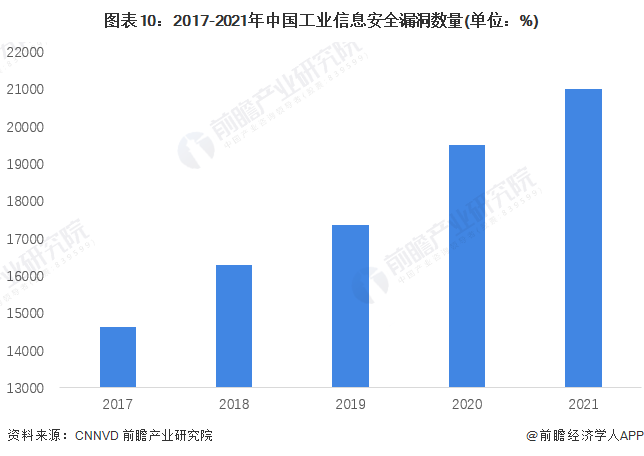 随着信息技术的不断发展,工业信息面对的外部信息环境也日趋复杂。根据国家信息安全漏洞库CNNVD的数据,近年来,我国在案工业信息安全漏洞数量不断增多,截至2021年末,我国工业信息安全漏洞数量超过了20000个。