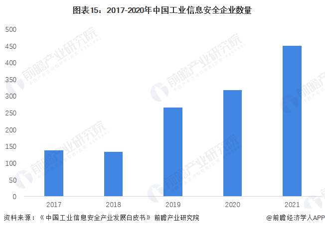 根据前瞻的初步统计,截至2021年末,我国记录在案的下设工业信息安全业务的企业数量将超过450家。