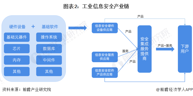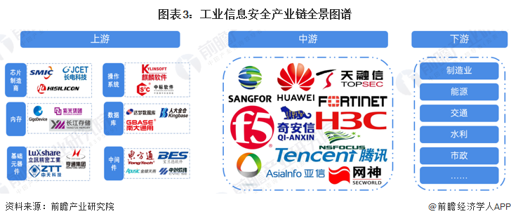 工业信息安全产业链的上游主要是一些硬件设备厂商和基础软件开发企业;产业链中游为安全集成服务提供商,包括信息安全硬件设备提供商、信息安全服务提供商和信息安全软件产品提供商;产业链下游主要为电力、烟草、轨道交通、冶金、石油石化、钢铁、煤炭、先进制造、燃气等对信息保护要求苛刻的企业。