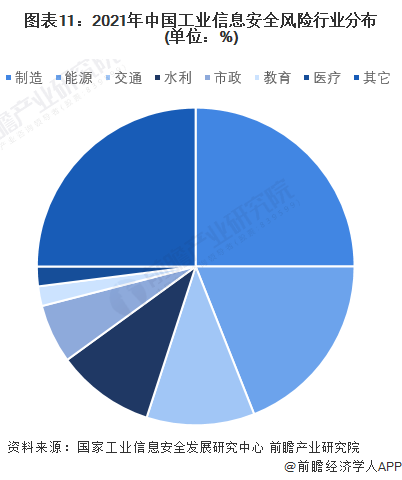 根据国家工业信息安全发展研究中心的数据,工业信息安全下涉行业包括了制造业、能源、水利、交通、市政等多个行业。2021年,工业信息安全风险最高的是制造业,在国家工业信息安全发展研究中心的抽样研判中数量占比25%。