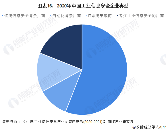 在国内涉及工业信息安全业务的企业中,根据业务发展背景可以分为自动化背景厂商、传统信息安全背景厂商、IT系统集成商以及专注工业信息安全的厂商四大类。其中,传统信息安全背景厂商的数量最多,2020年该类工业信息安全企业的数量占比达到了56%。